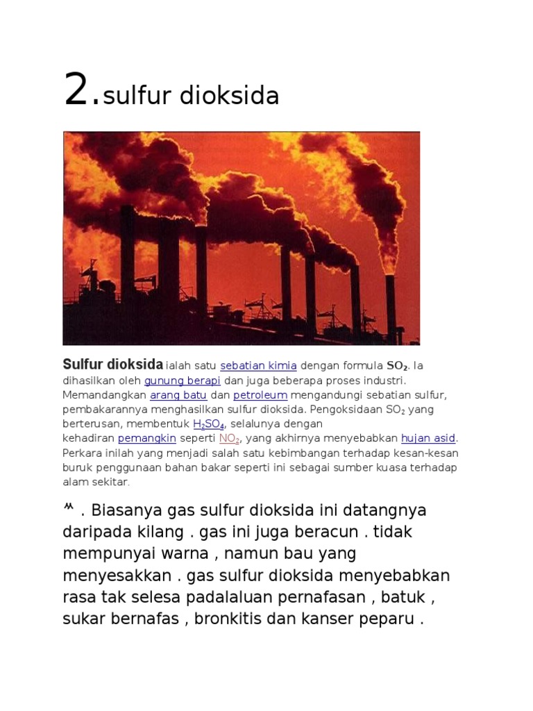 Evolusi Akademik Sulfur Dioksida Sulfur Dioksida Boleh Menyebabkan Pencemaran Alam Sekitar Menghidu Gas Sulfur Dioksida Yang Berlebihan Akan Mengakibatkan Penyakit Berkaitan Sistem Respirasi Apabila Gas Sulfur Dioksida Larut Dalam Air Hujan